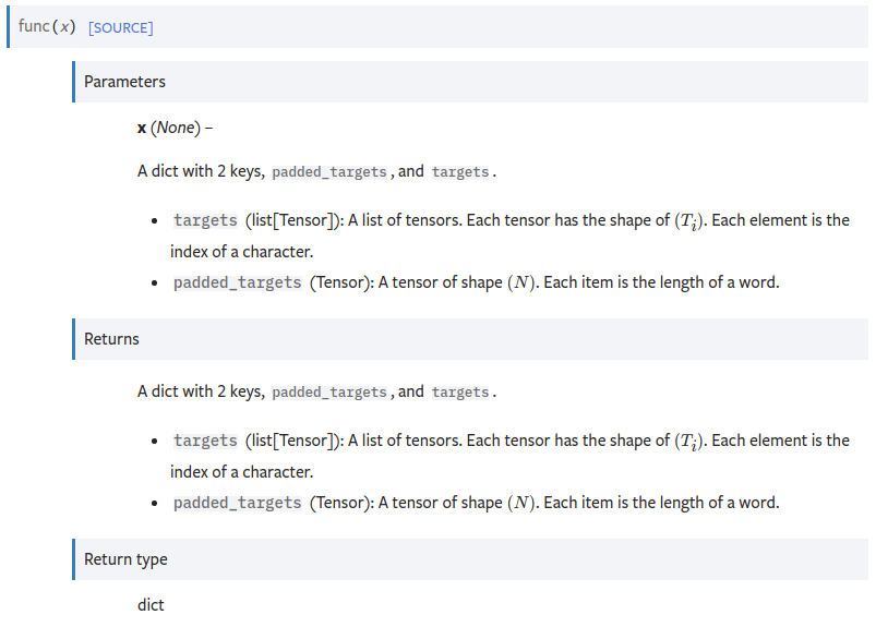 与注释不同,一份规范的 docstring 有着严格的格式要求,以便于 Python 解释器以及 sphinx 进行文档解析,详细的 docstring 约定参见 PEP 257。此处以例子的形式介绍各种文档的标准格式,参考格式为 Google 风格。