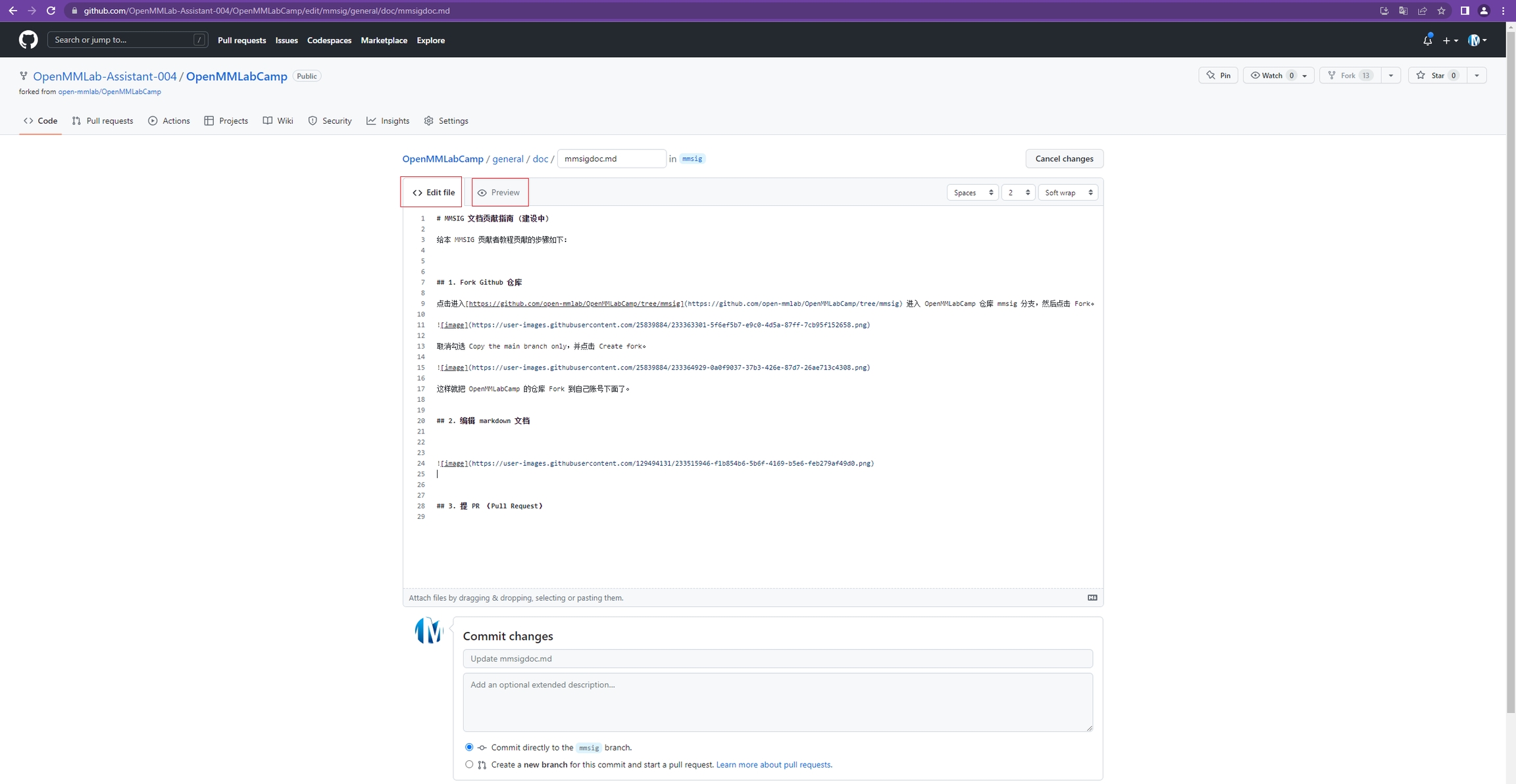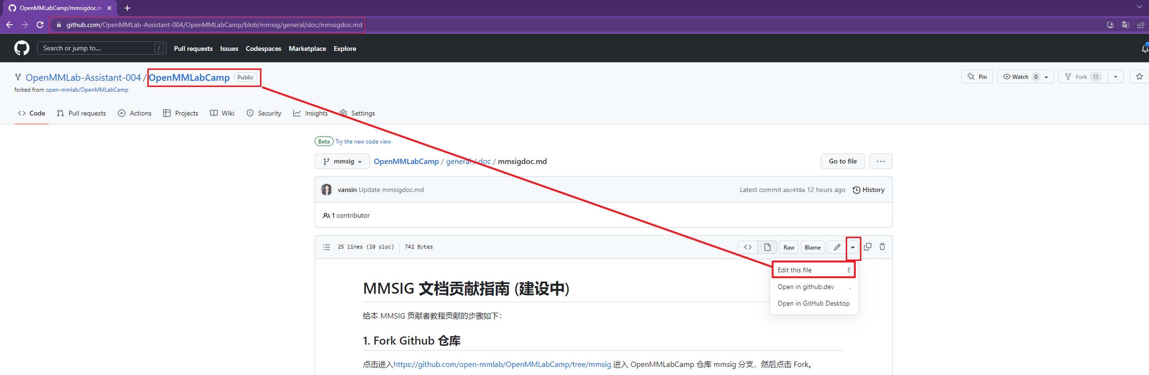 在 OpenMMLabCamp 的 mmsig 分支找到需要编辑的对应文档,我们点击进行编辑。