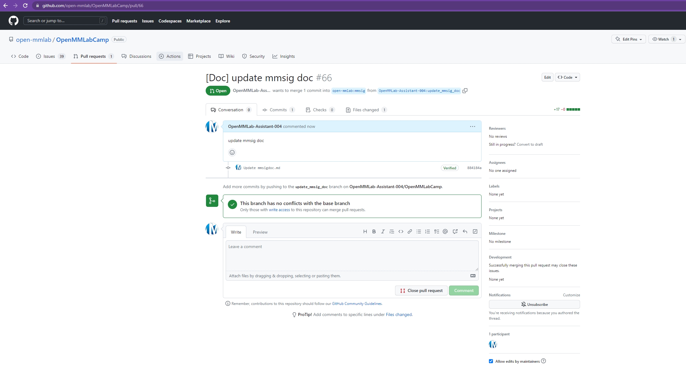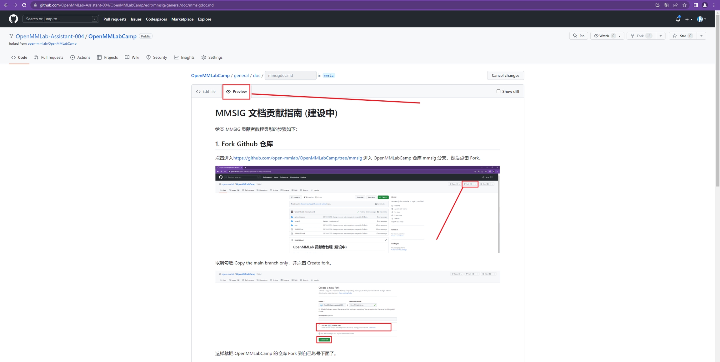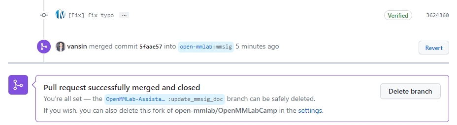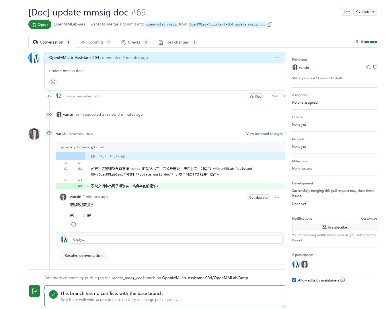 如果社区管理员没有直接 merge 而是给出了一下修改建议,请在上文中对应的 OpenMMLab-Assistant-004/OpenMMLabCamp中的 update_mmsig_doc 分支中对应的文档进行修改。