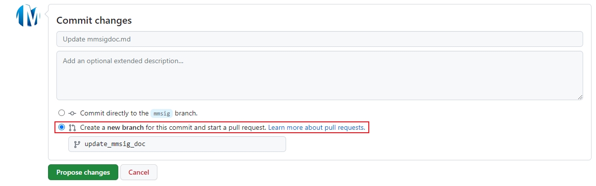 在完成文档的编辑后,我们在底部的 Commit changes 中选择 ** Create a new branch for this commit and start a pull request.**, 并给分支命名,这里命名为 update_mmsig_doc 分支,然后点击 Propose changes
