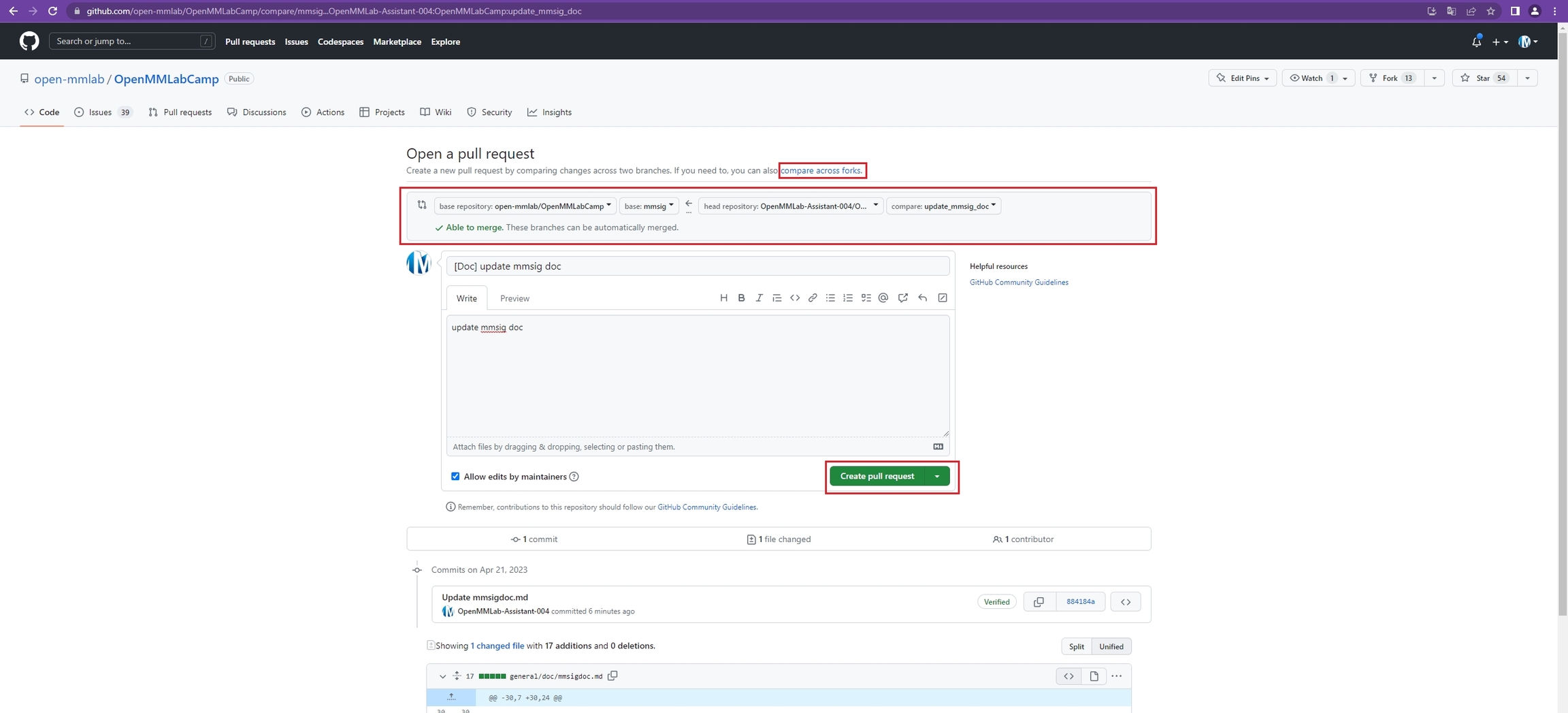 点击 compare across forks, 并选择刚刚选择 OpenMMLab-Assistant-004/OpenMMLabCamp中的 update_mmsig_doc 分支 创建 Pull Request 到 open-mmlab/OpenMMLabCamp中的 mmsig 分支,编辑好Pull Request 的标题和详细内容后,点击 Create pull request。