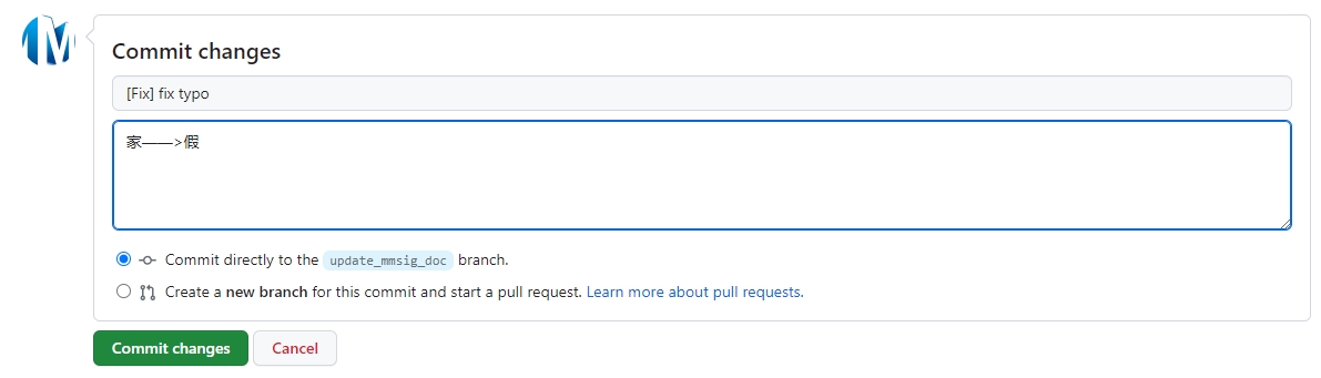 修改 PR 中的内容,不需要重新创建新的分支,只需要在原来的 PR 对应的分支上修改内容,并在修改内容后填写 commit changes 的标题和内容,并选择 Commit directly to the update_mmsig_doc branch. 并点击 Commit changes 。此时在 PR 界面出现了 [Fix] fix typo 的记录,我们点击 Resolve conversation。