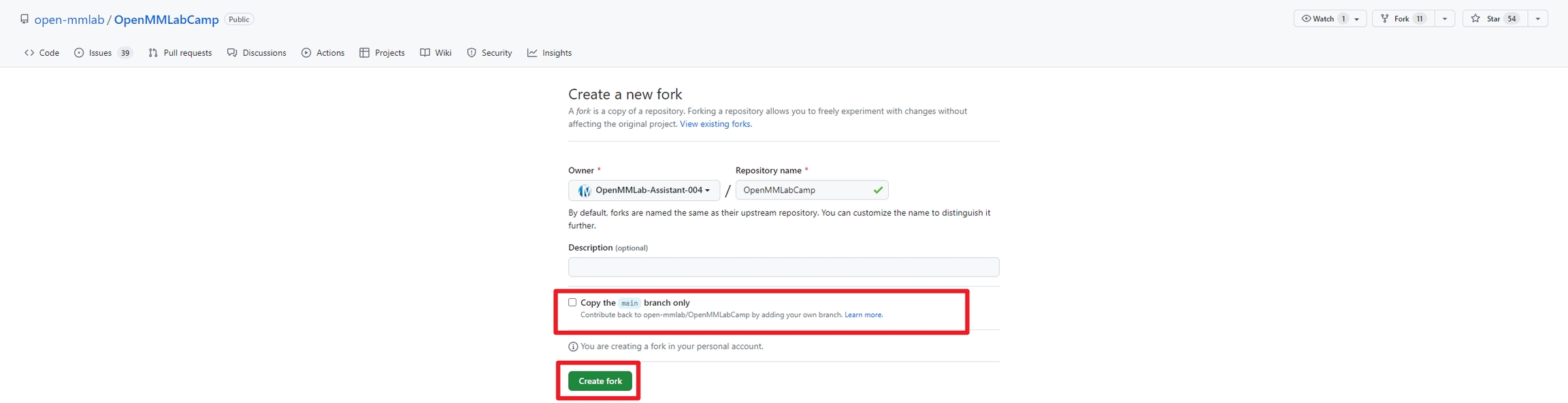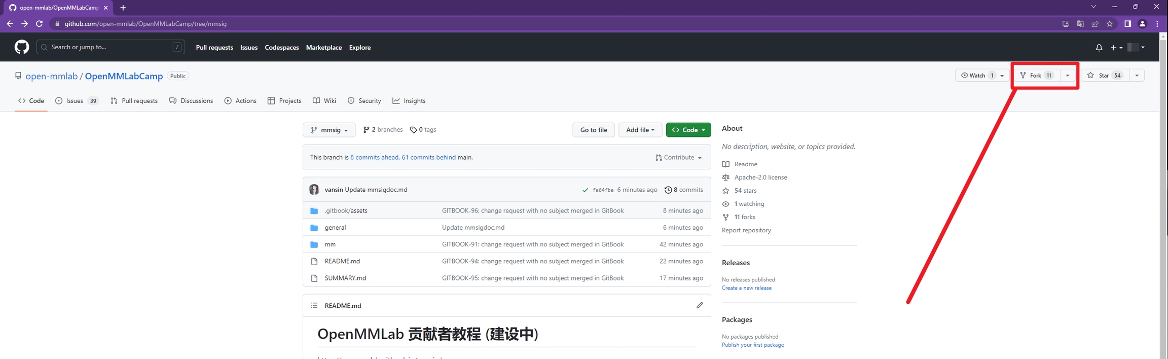 点击进入https://github.com/open-mmlab/OpenMMLabCamp/tree/mmsig 进入 OpenMMLabCamp 仓库 mmsig 分支,然后点击 Fork。