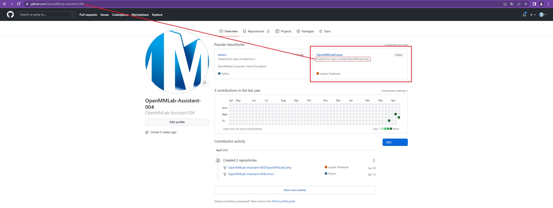 这样就把 OpenMMLabCamp 的仓库 Fork 到自己账号下面了,可以看到本教程的演示账号 OpenMMLab-Assistant-004 下面多了一个 OpenMMLabCamp