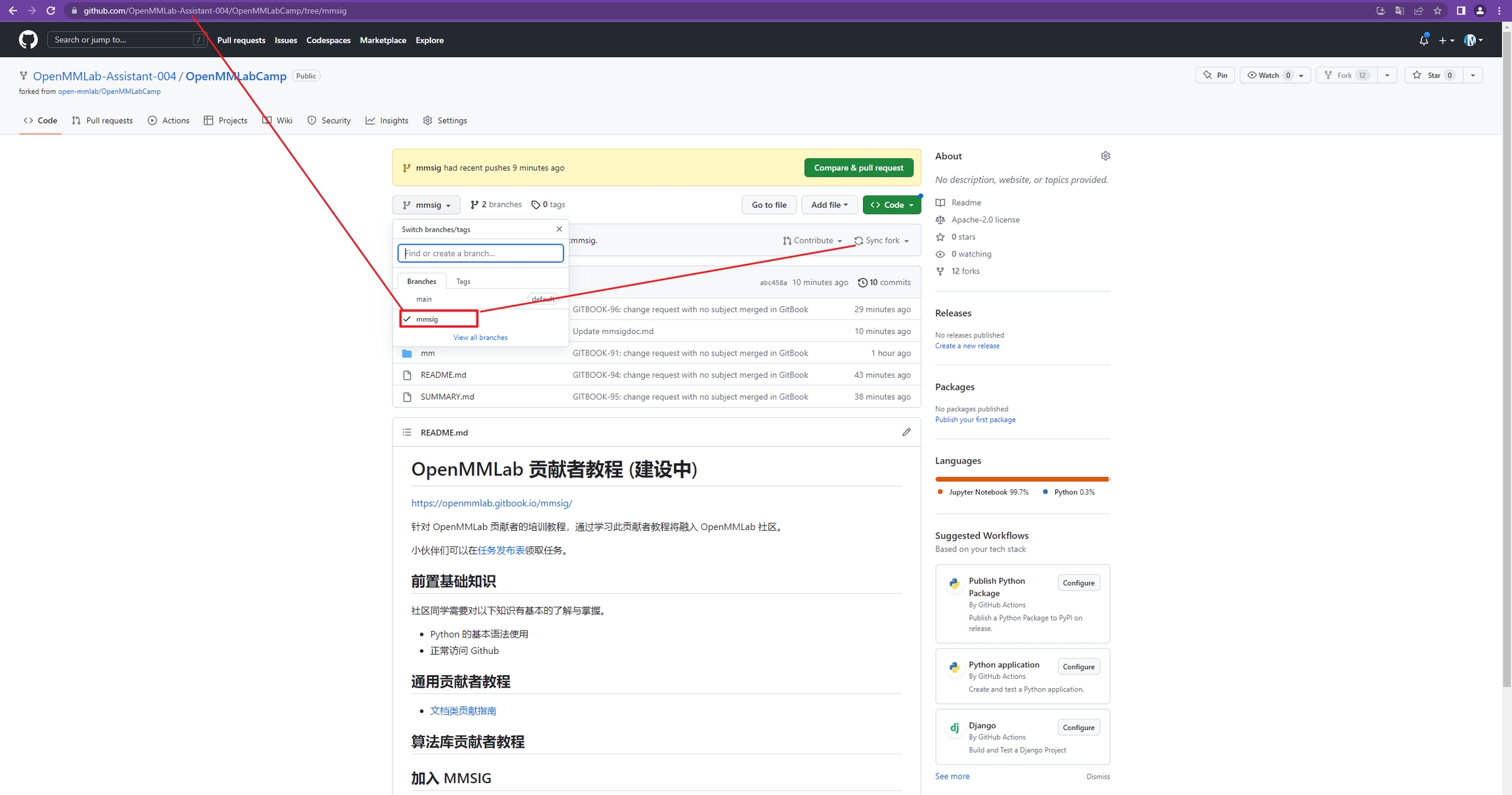 我们点击自己账号中 OpenMMLabCamp 仓库,切换到 mmsig 分支。