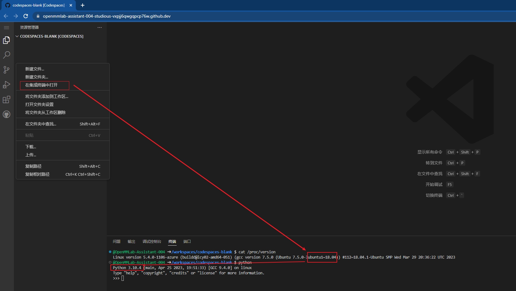在工作区点击鼠标右键,并选择在集成终端中打开,输入以下命令查看 ubuntu 版本为 18.04,Python 版本为 3.10.4。