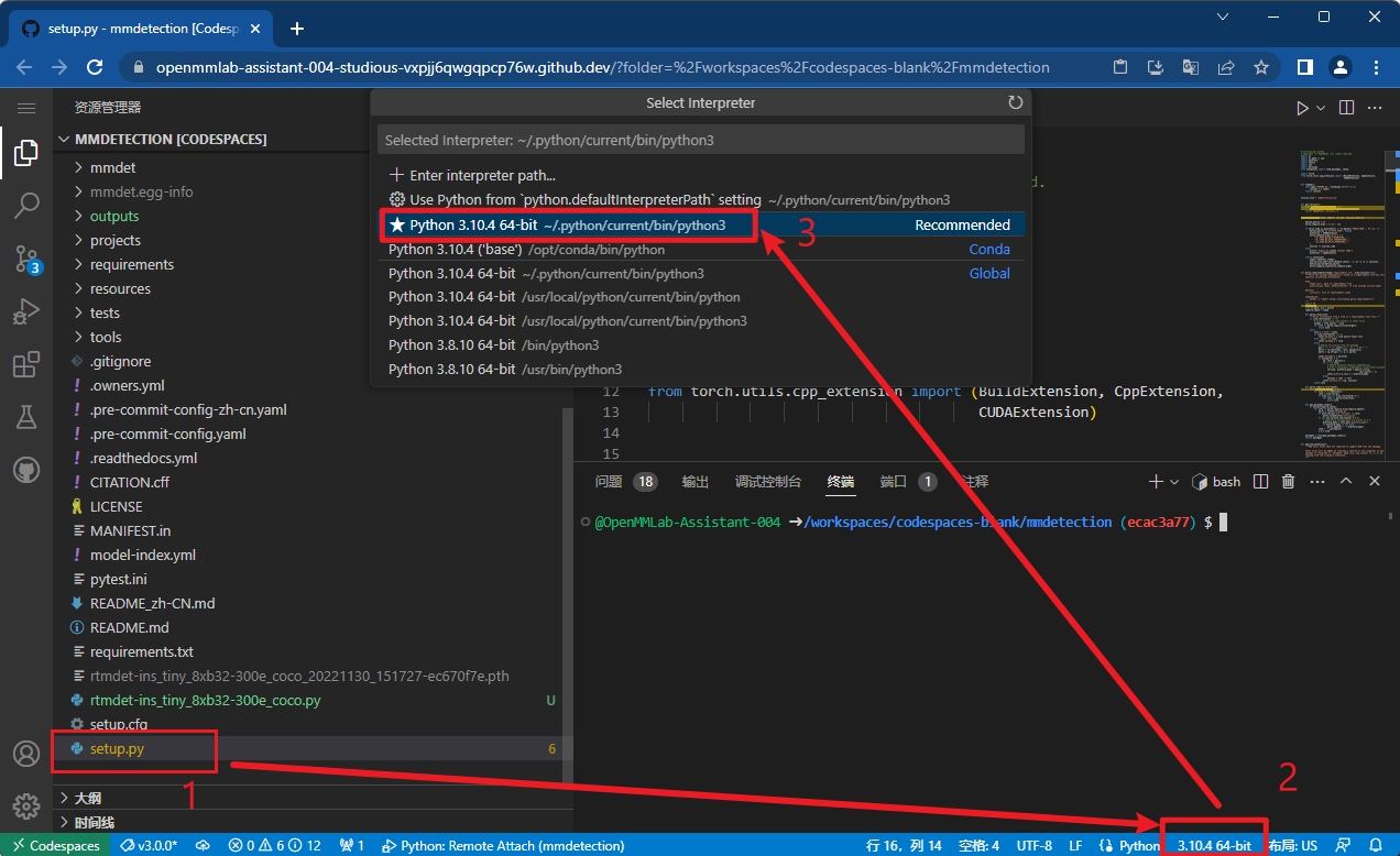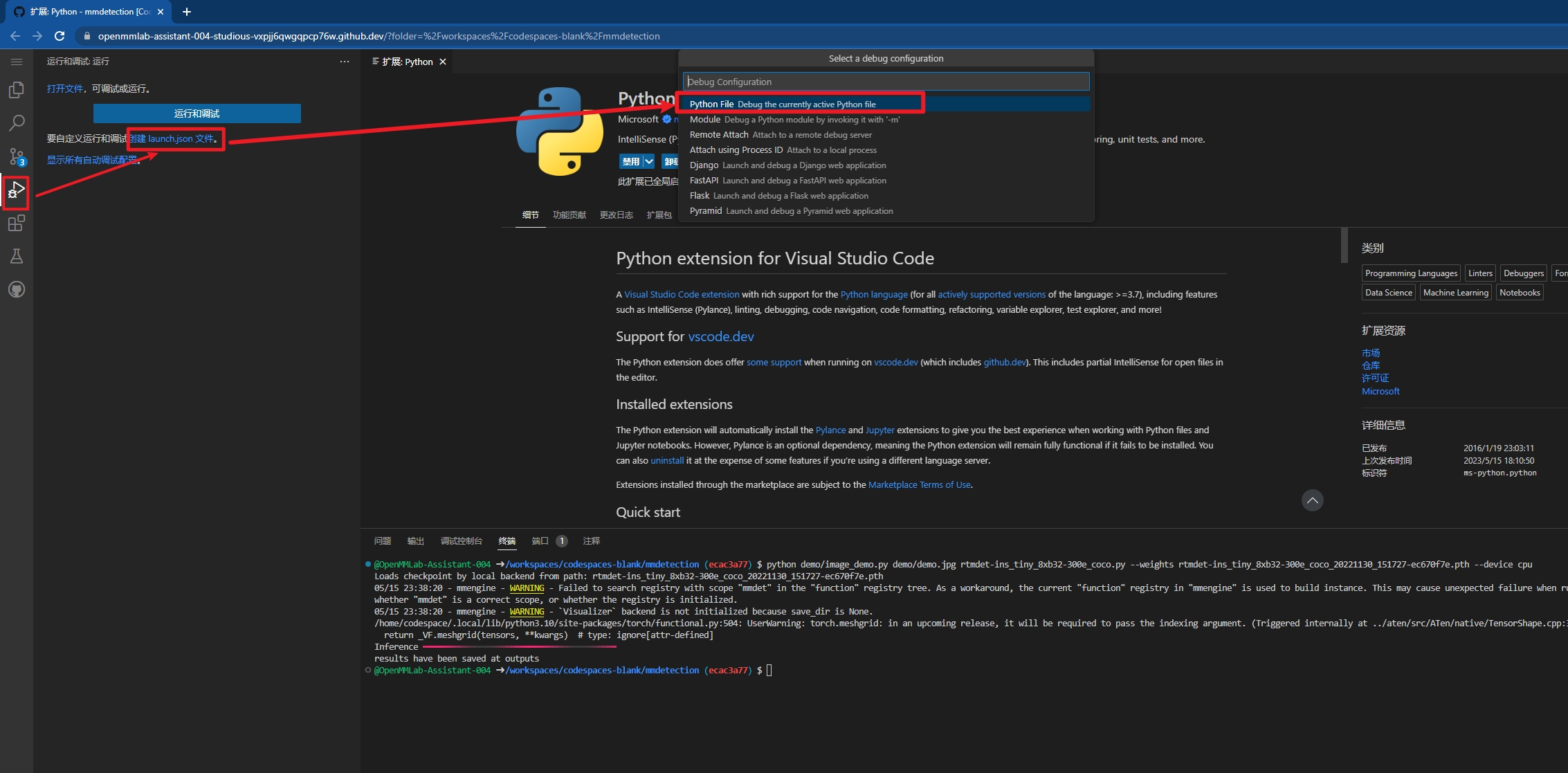 我们可以看到系统环境的 python 预装了 torch 的版本为 2.0.0。在本文中就不安装 miniconda 和虚拟环境了,就直接使用 codespace 的默认环境进行代码的调试了。