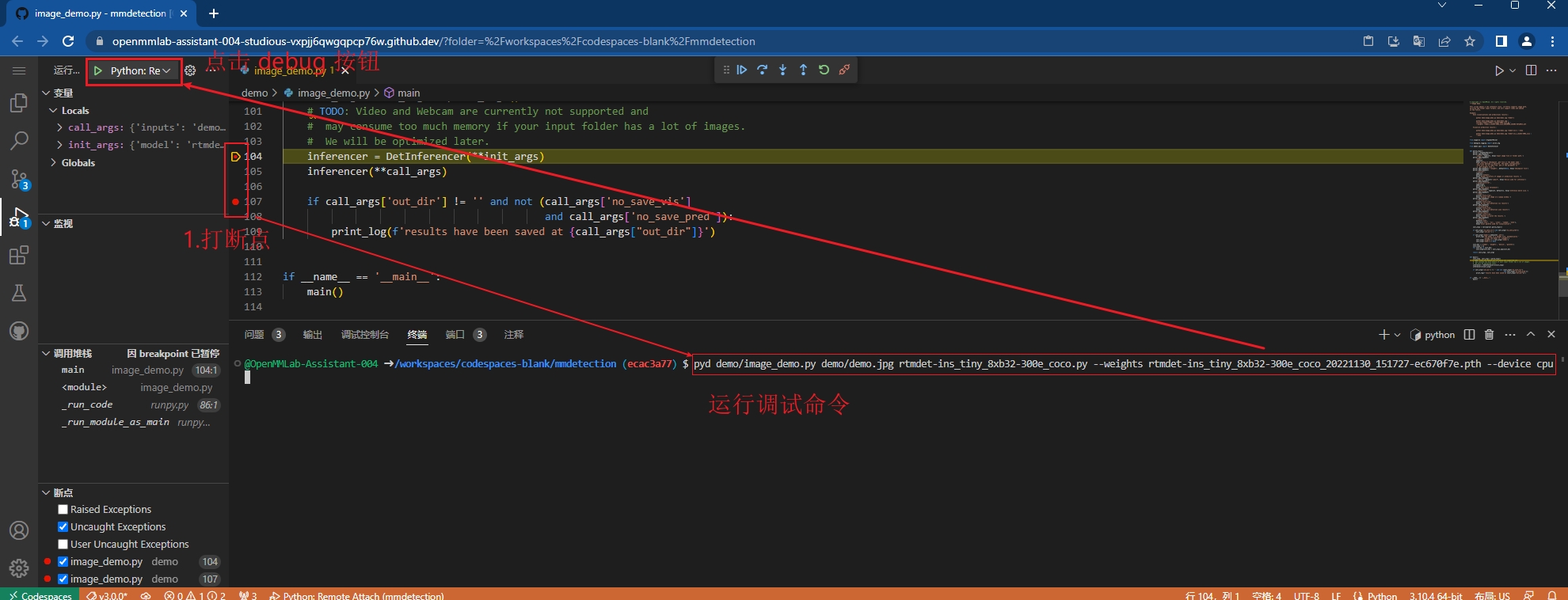 这样我们先在程序中打断点,然后在命令行的mmdetection路径下运行命令以上命令,最后点击 Python:Remote Attach 按钮就能打断点进行调试了。