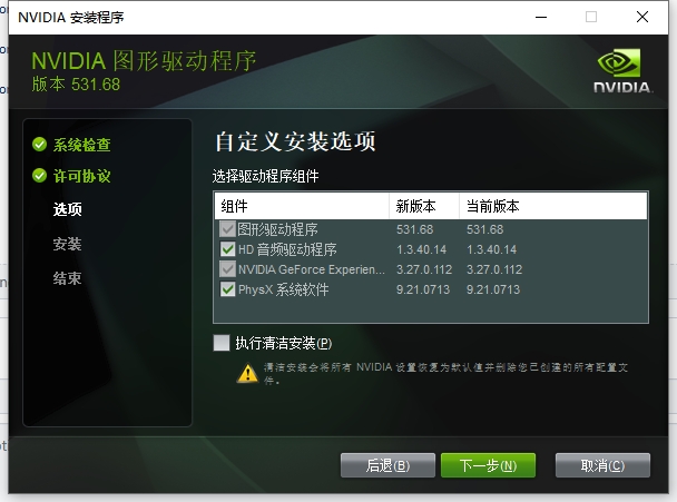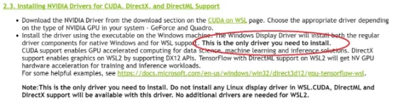 大家可能会有这样的疑问:不是安装 WSL2 的显卡驱动吗?为什么会装 Win10 系统上的显卡驱动?其实,官网文档上说明了,带有 WSL2 的官方 NVIDIA 驱动是整个过程唯一要装的 GPU 驱动!所以后面关于 Linux 上的 cuda toolkit 的配置就要求不勾选 Driver!