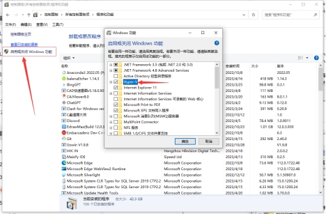 进入控制面板的 “程序和功能” 里边的设置,勾选 “ Hyper-V ” 和 “适用于 Linux 的 Windows 子系统” :