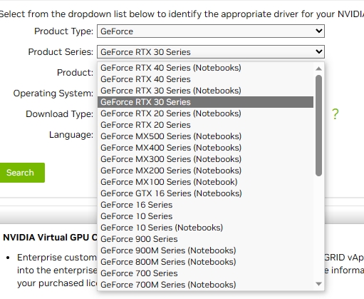 根据自己显卡的型号选择驱动,Notebooks 代表笔记本,我是台式电脑 3080 显卡,所以选择 GeForce RX 30 Series 下的 GeForce RX 3080。
