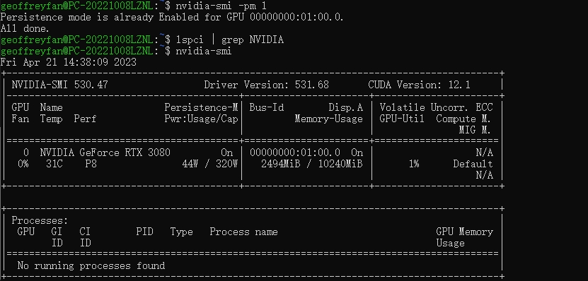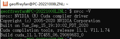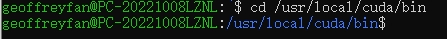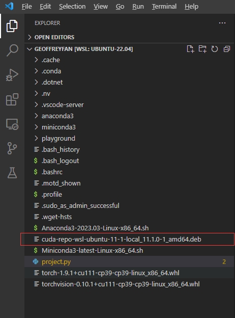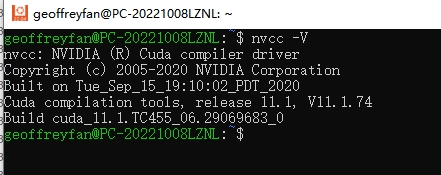 小知识:在执行了 wget https://developer.download.nvidia.com/compute/cuda/11.1.0/local_installers/cuda-repo-wsl-ubuntu-11-1-local_11.1.0-1_amd64.deb 指令后,Ubuntu-22.04 Linux 子系统的 /home/geoffreyfan (这里是你自己的用户名字) / 路径下会出现相应的安装包,后面重新安装,直接执行 sudo dpkg -i cuda-repo-wsl-ubuntu-11-1-local_11.1.0-1_amd64.deb 就可以了,不用再反复下载安装包: