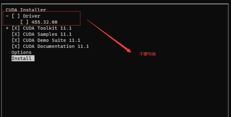 注意:在 sudo apt-key add /var/cuda-repo-wsl-ubuntu-11-1-local/7fa2af80.pub 指令之后,安装的过程中不要勾选 Driver 否则会下载失败: