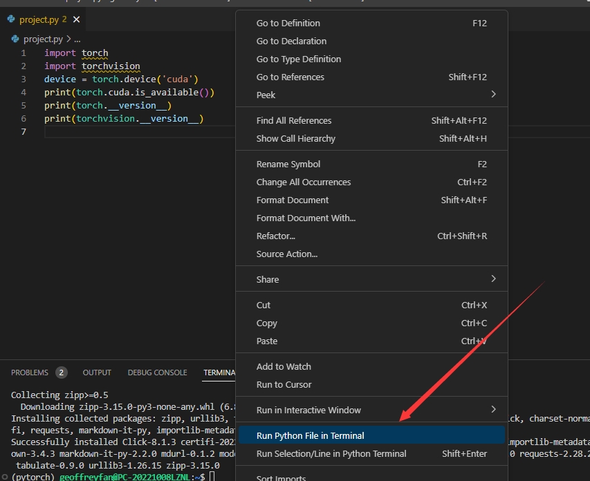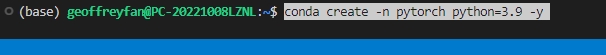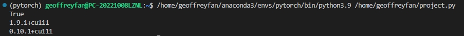 配置好后,我们在终端运行我们创建的python文件,会发现 (base) 标志变成了我们的虚拟环境的名称 (pytorch) :