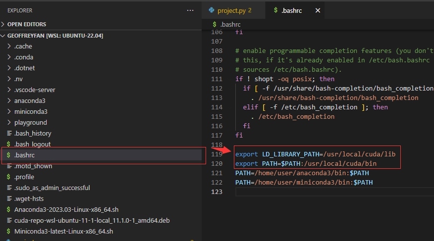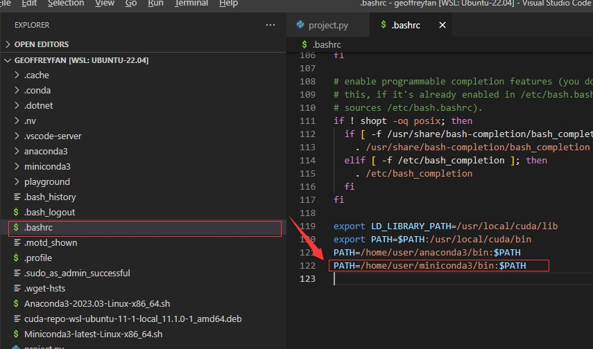 将以下添加到 Ubuntu-22.04 Linux 子系统的 /home/geoffreyfan (这里是你自己的用户名字) / 路径下的 .bashrc 文件里面: