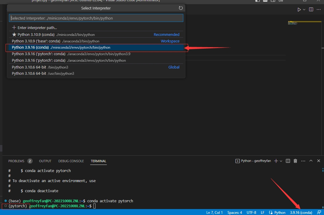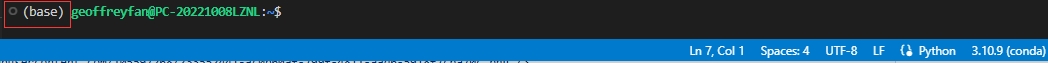 创建一个 project.py 文件,配置 miniconda 路径下的 python 解释器,并在终端执行该 python 文件,如果前面有 (base) 这个标志,那么说明 miniconda 配置成功: