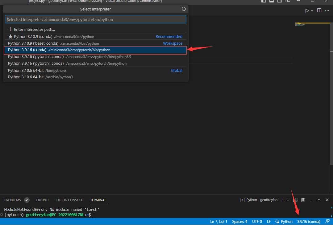 配置好虚拟环境后,我们配置 miniconda 下我们创建的虚拟环境下的解释器: