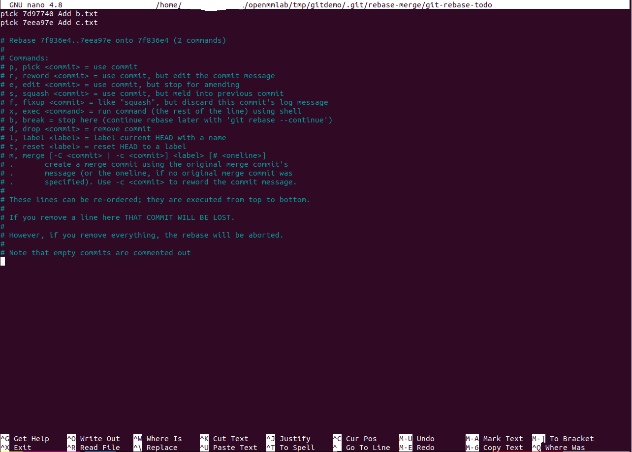 此时会出现交互界面,如下图左。可以看到相关的 commit 被逐行列出,并且每个 commit 前面有一个指令(pick),这个指令是可以按照需求修改的,所有可选项都在下方的注释中有说明。例如,我们现在希望合并2个 commit, 则可以将第一个 7d97740 的指令设置为 reword,将第二个 7eea97e 的指令设置为 fixup,如下图中,然后保存退出。由于第一个指令是 reword,接下来会跳出重新输入 commit message 的界面,我们将原本的 “Add b.txt” 改成 “ Add b.txt and c.txt ”, 并保存退出,如下图右。