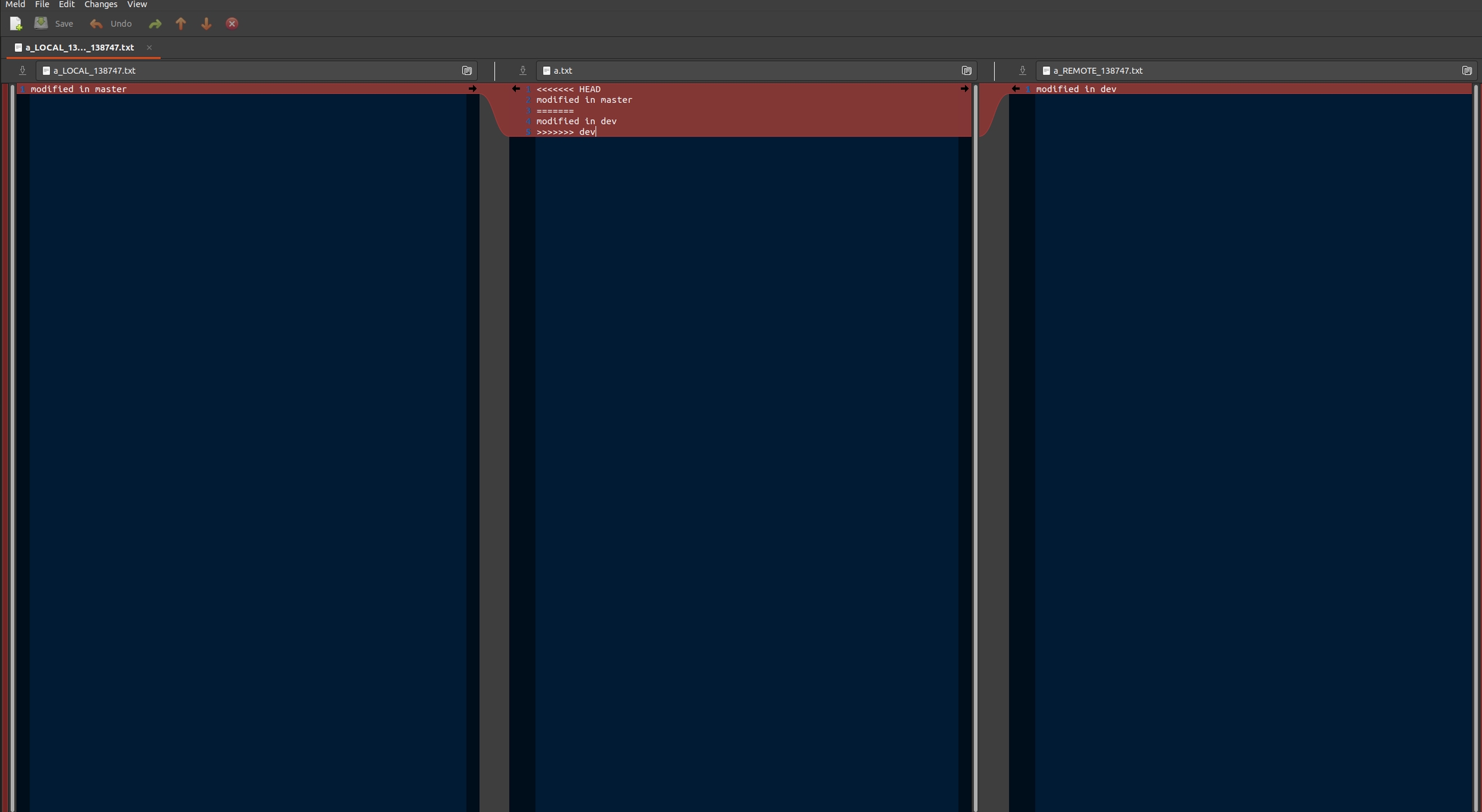 完成这些配制后,当需要解决冲突时,Git 会自动启动 meld,界面如下图所示。可以看到界面分成三列,对应与上面设置中的L11,分别是本地分支内容、合并后内容和目标(远程)分支内容。在这个界面中可以清晰对比两个分支的不同,还可以三列之间的箭头状按钮选快速选择内容添加到对应文件中。这里要注意,LOCAL 和 REMOTE 对应的分支,在 merge 和 rebase 两种情况下是不同的,这在 git-rebase 说明 中做过介绍。