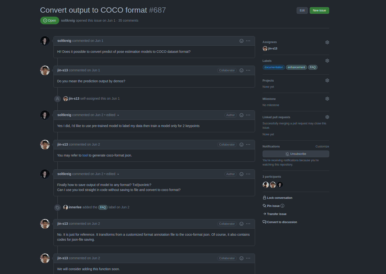 Issues 页面类似用于社区沟通的论坛。使用者可以在这里创建 issue 来提出遇到的问题,报告发现的 bug,或提出意见建议等;开发者可以在 issue 下进行回复,或将 issue 指定(assign)给特定的人来解决。此外,还可以用 issue 功能发布消息,如项目的 Roadmap、开发计划等,并将这些重要信息置顶。每个 issue 都会有一个编号,如 #900, 可以用于在其他 issue 或稍后将介绍的 Pull Request 中关联这个 issue。