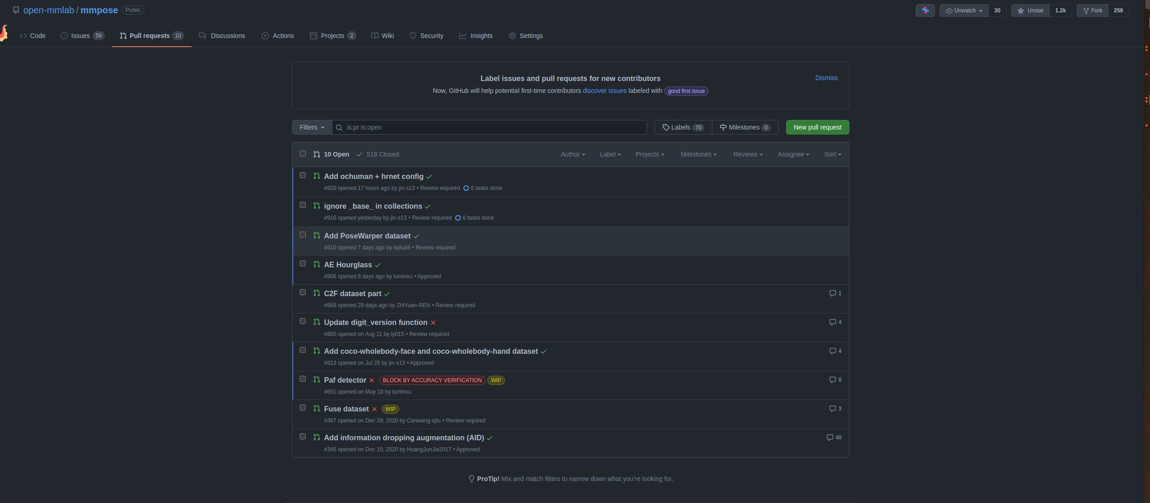 GitHub (https://github.com)是最大的 Git 版本库托管平台,包括 OpenMMLab 在内的许多开源项目使用 GitHub 网站实现代码托管、版本管理、问题追踪、社区交流等功能。即使你还不熟悉 Git 的使用,也很可能已经使用过 GitHub 来查找所需的开源软件或资料。我们首先简单熟悉一下 GitHub 的页面和基本功能。 以 MMPose (https://github.com/open-mmlab/mmpose)为例,一个软件项目在 GitHub 上的首页通常如下图所示: