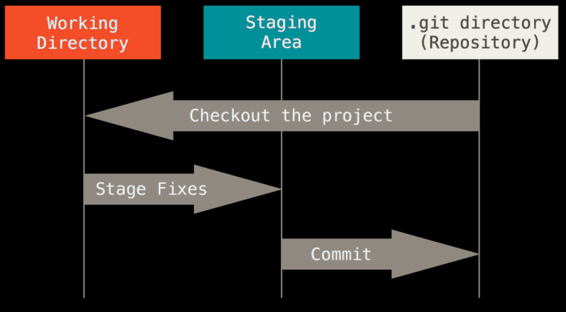 现在请注意,如果你希望后面的学习更顺利,请记住下面 Git 中的这三个区,工作区(Working Directory)、暂存区(Staging Area) 以及 Git 仓库区(.git directory)。