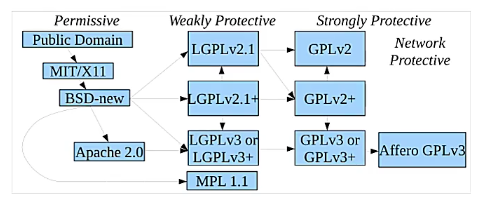 MIT 最自由,任何人都可以售卖我的软件,甚至可以用我的名字促销。 BSD 和 Apache 协议也很自由,跟 MIT 的区别分别是不允许用作者本人名义促销和保护作者版权。GPL 族最严格,对代码的修改部分也必须是 GPL 的,同时基于 GPL 代码而开发的代码也必须按照 GPL 发布,而 MPL ,也就是 Mozilla Public License 就温和一些,如果后续开发的代码中添加了新文件,同时新文件中也没有用到原来的代码,那么新文件可以不必继续沿用 MPL 。
